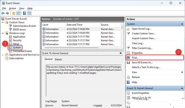导航到“Windows 日志>系统”。你将看到大量事件的列表。单击右侧窗格中的“查找”。