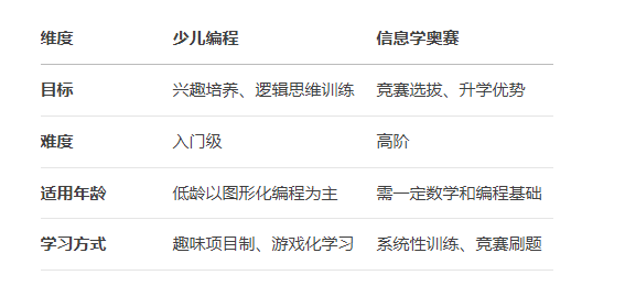 信息学奥赛和少儿编程既有联系又有区别,类似于"奥数与数学"的关系——少儿编程是基础学科,信息学奥赛则是高阶竞技舞台。