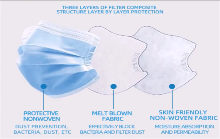 为了保证更好的防护效果,医用口罩并非简简单单的一层布。按照相关规定,医用外科口罩至少需要有外、中、内三层。从使用需求来看,外层需要初步阻隔飞沫和其他感染源,中层需要进行进一步的过滤,而为了更好的使用感受,内层需要有吸湿的功能。因此,医用外科口罩的外层与内层选择使用纺粘无纺布,保证较好的透气性;而中层则选择使用过滤性和吸液性都更强的熔喷无纺布。