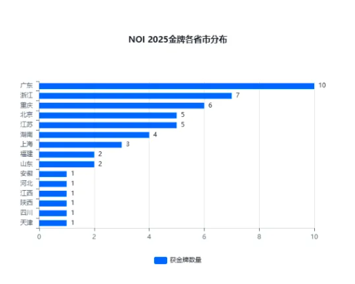 NOI2025共有32个省市参与,其中有15个省份有选手摘得金牌,包括广东、浙江、重庆、北京、江苏、湖南、上海、福建、山东、安徽、河北、江西、陕西、四川、天津等。
