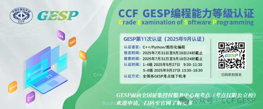 GESP,即CCF编程能力等级认证(Grade Examination of Software Programming),由中国计算机学会(CCF)发起并主办。CCF在计算机领域颇具权威性,其主办的竞赛活动广受认可。GESP专为青少年计算机编程学习者打造,是一个能力验证平台,旨在提升青少年计算机和编程教育培训水平,推广普及编程教育,选拔优秀人才。其适用年龄范围较广(6-18岁),覆盖了中小学阶段,符合年龄条件的青少年均可参与。