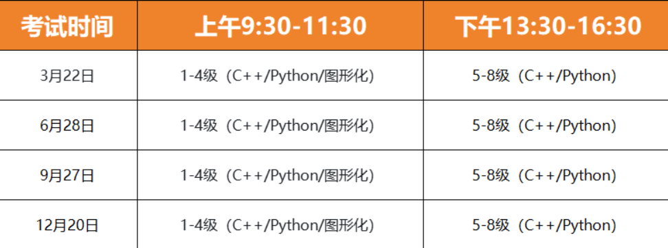 不同级别对应不同的编程知识和技能要求,学生可根据自身学习情况选择相应语言和级别报考。