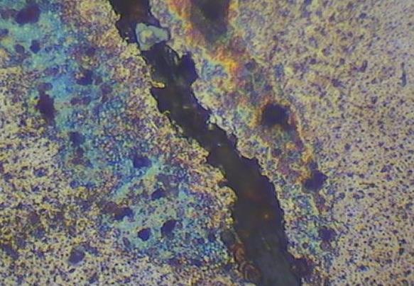 探伤宜采用荧光磁粉进行探伤,使缺陷显示更为清晰,麻点孔洞缺陷为锻造过烧所致。